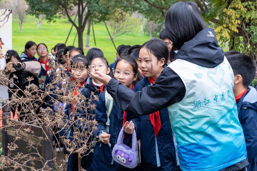 “你们知道这株植物是哪种中药吗?”药学院本草社的志愿者指着百草园中的一丛绿叶植物向小学生们提问,“这是铁皮石斛,一般生于砂石之上,不沾土气、不近邪气,我们应如铁皮石斛般汲取社会大环境中长存的正气,不贪、不骄、不躁,不断锤炼自己。”志愿者结合廉洁文化将中草药的知识向“小神农们”娓娓道来。小学生们穿梭于百草之中,聆听中草药的故事,触摸中草药的叶脉,闻着中草药的清香,用笔记录中草药的形态,在百草园中切身感受中医药文化的独特魅力。