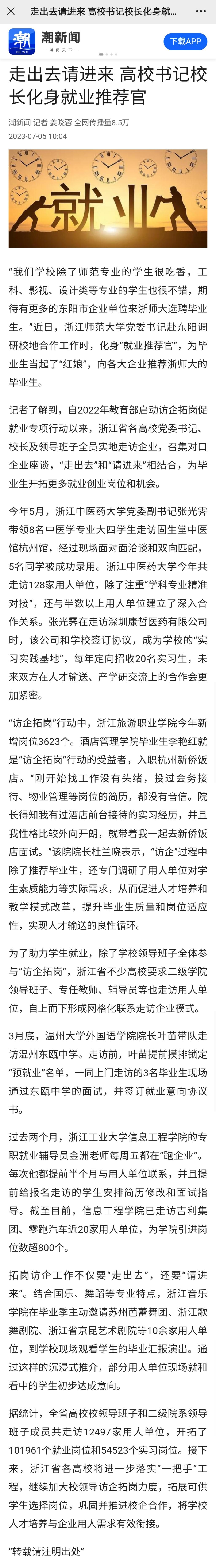 记者了解到,自2022年教育部启动访企拓岗促就业专项行动以来,浙江省各高校党委书记、校长及领导班子全员实地走访企业,召集对口企业座谈,“走出去”和“请进来”相结合,为毕业生开拓更多就业创业岗位和机会。