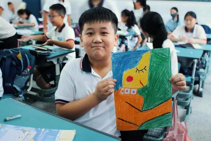 “树叶在枝桠上可以组成大树,在画纸上可以组成山山水水、花果、小动物。在唐老师的讲解下,我对大自然的向往又增添了不少。”陈诗蕊同学说。