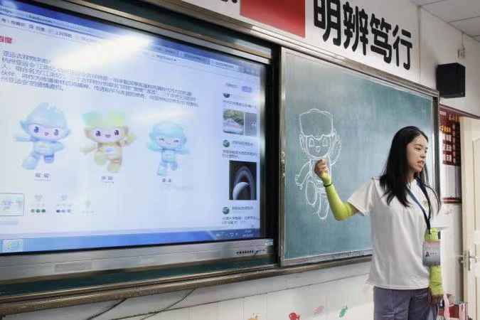 在社会实践的这段时间中,团队成员还在当地的东二小学开展了以乡风美育为主题的公益课堂,设计了书画研学课程,组织开展了一系列融入亚运元素的百两村假日亲子活动。