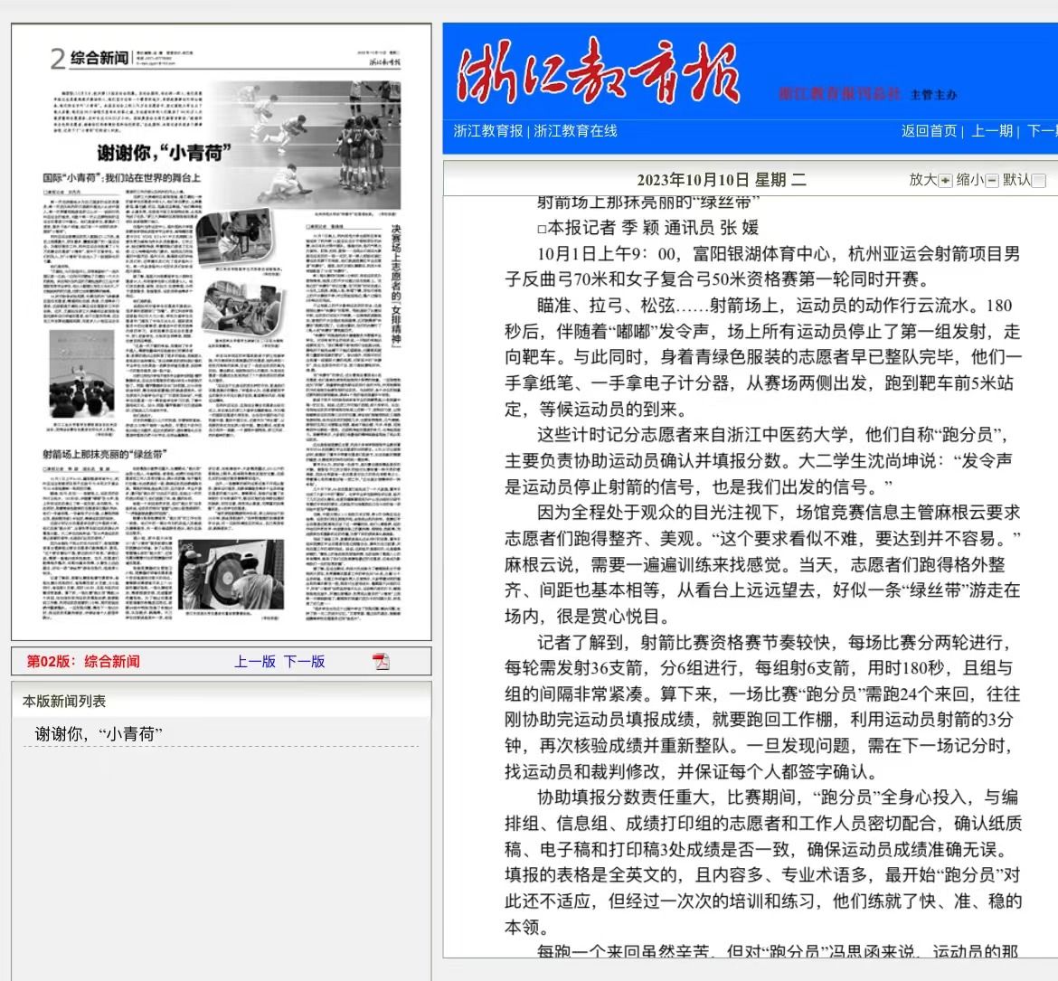 10月8日,杭州第19届亚运会闭幕。亚运会期间,有这样一群人,他们是最早抵达也是最晚离开赛场的人,他们坚守在每一个需要的地方,串联起赛事运行的全链条,他们的名字叫“小青荷”。本届亚运会上的3.76万名志愿者中,浙江高校大学生占了绝大多数,他们在96个场馆尽显有礼好客之道,为远道而来的人们提供了44.90万人次高质量的志愿服务,总时长达434.83万小时。国际奥委会主席巴赫留言寄语:“感谢所有出色的志愿者,谢谢你们的热情好客和灿烂笑容。”在此期间,本报记者走进多个赛事场馆,记录下了“小青荷”们的动人时刻。